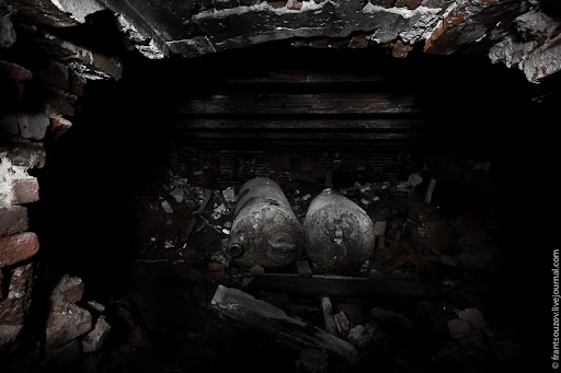 Через пролом в полу спускаемся в подвал, где сохранились старинные котлы парового отопления замка.